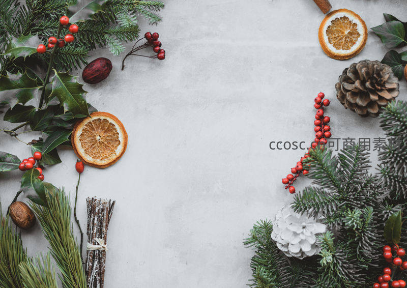 以松枝、冬青浆果、干橙片和松果在浅灰背景上构成自然边框,简约而富有季节感,适合用作节日贺卡或设计素材。