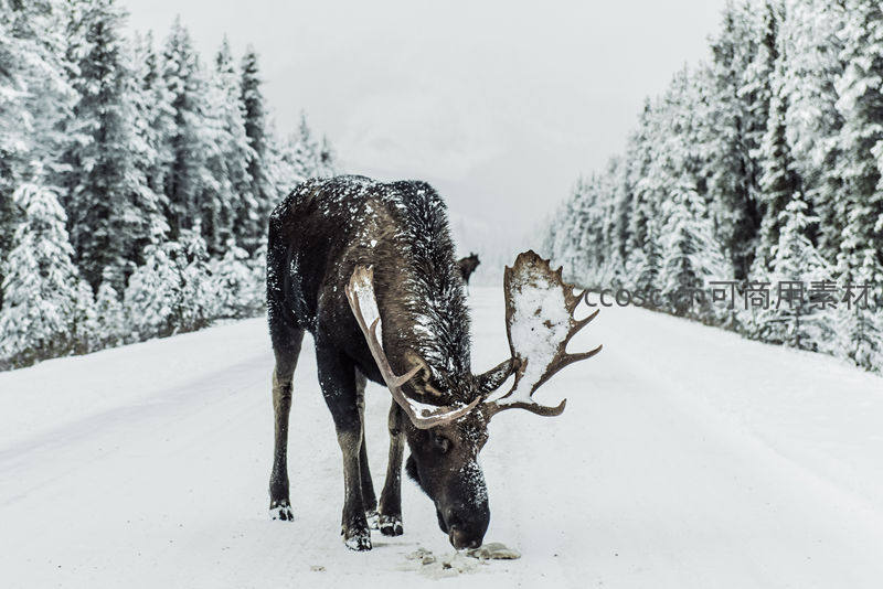 一只雄壮的公麋鹿伫立在被厚厚白雪覆盖的林间公路上,它低头在雪中觅食,身后是连绵的雪松林,构成一幅宁静而野性的冬日画卷。