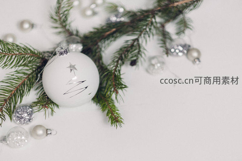 白色圣诞球与翠绿松枝在纯白背景下构成清新静物画面,点缀银色闪亮小球,展现极简而优雅的节日美学。