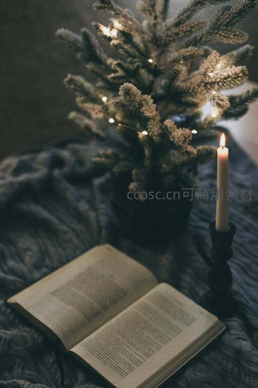 烛光下的小圣诞树与翻开的书