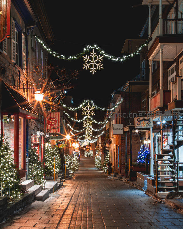 夜晚的石板街道两旁建筑灯火通明,空中悬挂着璀璨的雪花形灯饰和串灯,营造出童话般的圣诞小镇氛围,吸引游客驻足拍照留念。