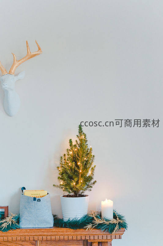 木质壁炉架上摆放着点亮小灯的迷你圣诞树、白色蜡烛与布艺收纳袋,墙上鹿头装饰增添自然野趣,整体氛围静谧温馨。