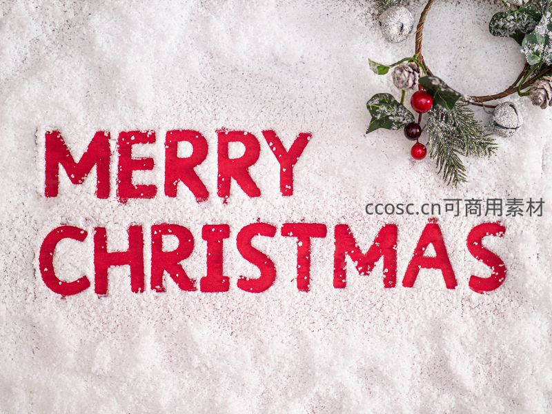 在洁白的雪地上,用鲜艳的红色字体拼写出“MERRY CHRISTMAS”,旁边点缀着松枝、浆果和银色铃铛组成的节日花环,营造出浓厚的圣诞氛围。