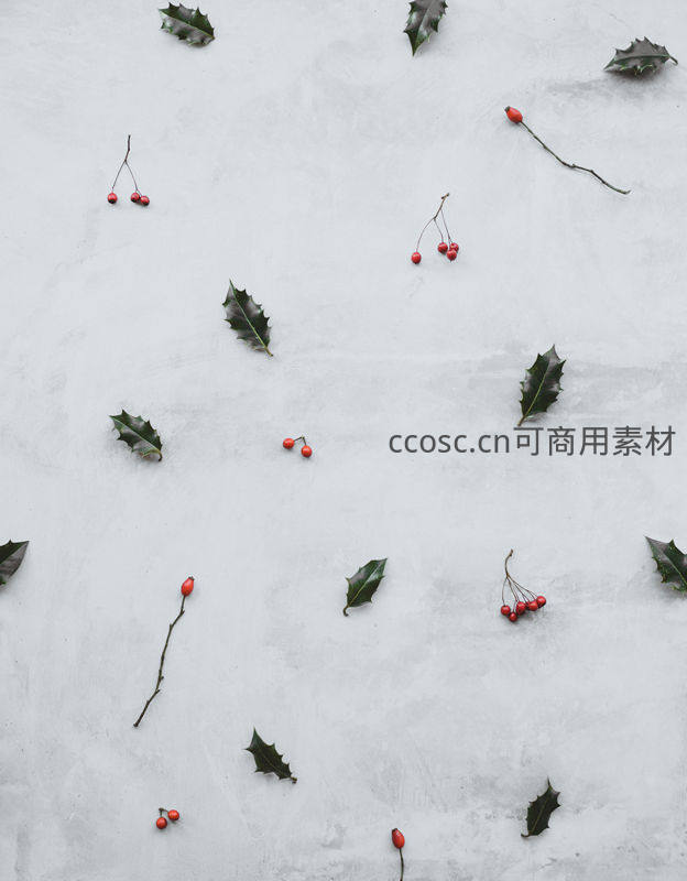 散落在浅灰纹理背景上的冬青叶片与鲜红浆果,以极简风格呈现,传递出宁静而清新的冬季自然美感。