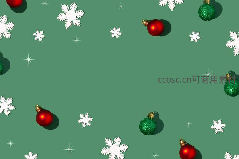 深绿色的平面上散布着闪耀的红色与绿色圣诞彩球,搭配洁白的雪花剪纸和星芒点缀,形成一个充满活力与喜庆感的节日主题构图,视觉效果清新明快。