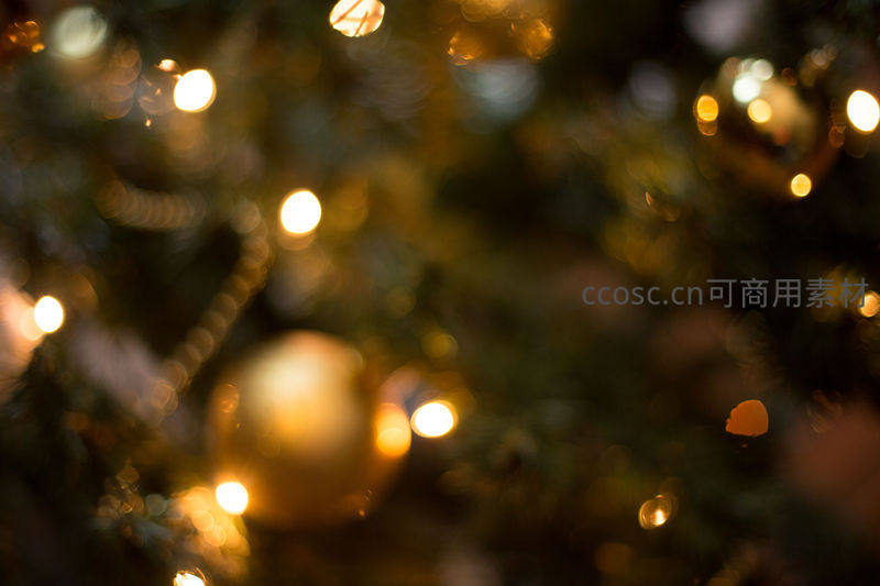 通过浅景深拍摄,圣诞树上的金色灯饰与球形挂件化为梦幻光斑,模糊的绿色枝叶作为背景,完美捕捉了节日夜晚的温暖与浪漫。