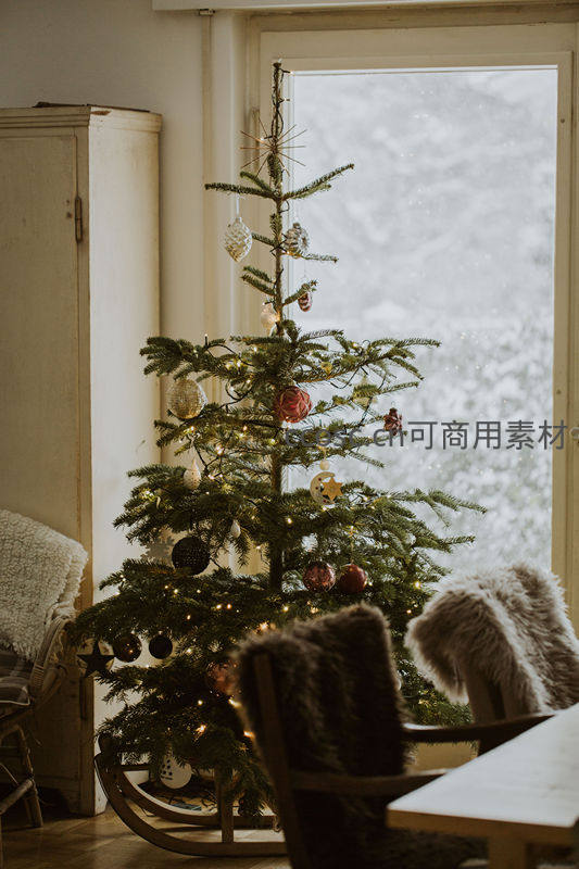 一棵装饰着彩灯与球饰的圣诞树静静伫立在窗边,窗外雪花纷飞,室内温暖舒适,营造出浓厚的节日氛围和家的温馨感。