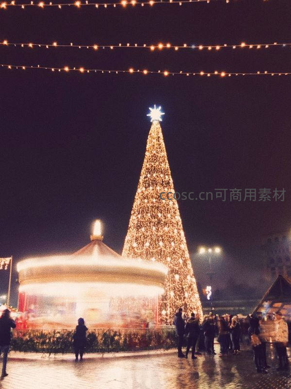 广场巨型圣诞树,旋转木马伴灯光