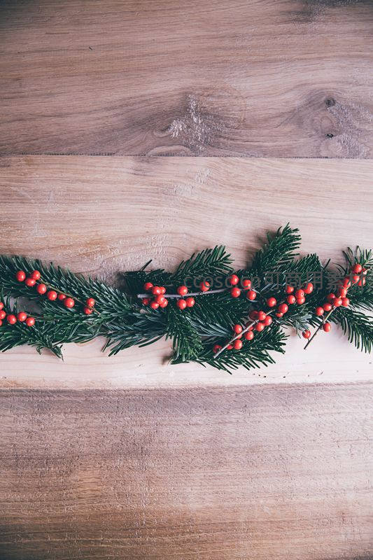 新鲜的绿色松枝缠绕着鲜红浆果,平铺在原木纹理桌面上,简约自然,传递出宁静而喜庆的节日气息。