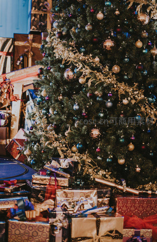 华丽圣诞树下堆满礼物,节日气氛浓郁