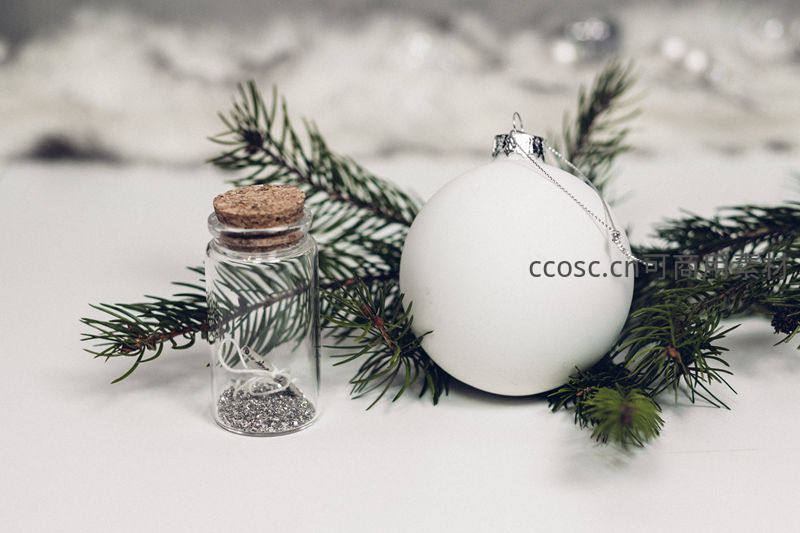 洁白的圣诞球与翠绿松枝相伴,旁置装有闪粉的小玻璃瓶,整体构图简洁清新,充满温馨的节日气息。