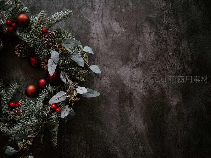 在深灰色纹理背景前,一簇由松枝、红浆果和松果组成的圣诞花环优雅地铺陈开来,留白设计突显了节日元素的精致与质感。