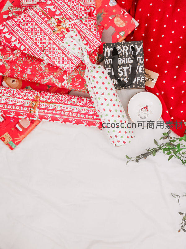 从上方俯瞰,各式各样的圣诞礼物堆放在白色床单上,搭配红色波点毯子和小碗,充满了准备节日惊喜的温馨与期待感。