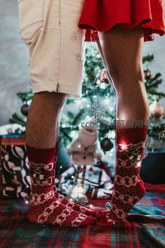情侣脚穿圣诞袜站在树下