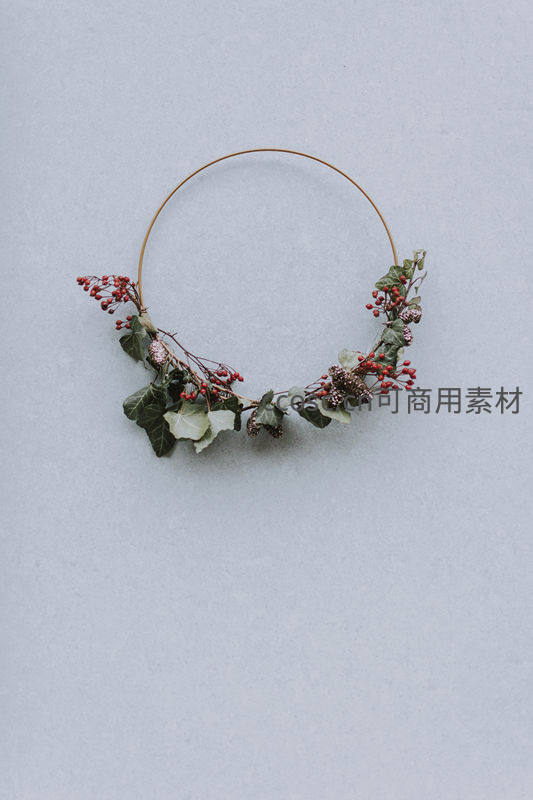 一个细金属圆环上缠绕着常春藤绿叶和鲜红浆果,置于纯色背景之上,呈现出一种宁静、自然又充满冬日气息的装饰美感。