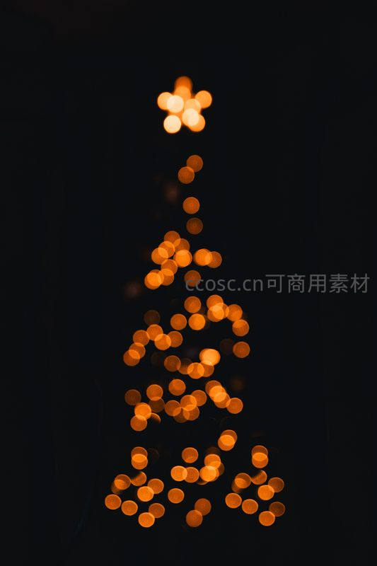 在深黑色背景中,由无数温暖的橙色光斑虚化成一棵圣诞树的形状,顶部是一颗明亮的星形光点,充满梦幻感。