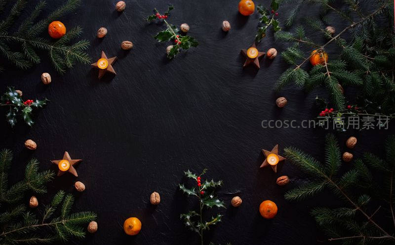 深色石板上,松枝、冬青、橘子和核桃环绕着星形蜡烛,营造出温馨宁静的圣诞氛围,适合节日贺卡或家居装饰。