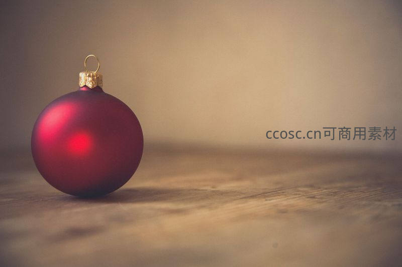 一颗光滑的红色圣诞装饰球静置在木质桌面上,背景柔和虚化,突显节日单品的质感与温暖氛围,适合节日布置灵感。