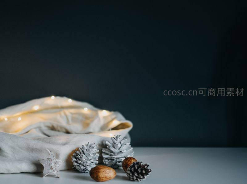 白色织物上缠绕着温暖的小灯串,搭配银色与原木色松果,营造出宁静而温馨的冬季家居氛围,充满节日气息。