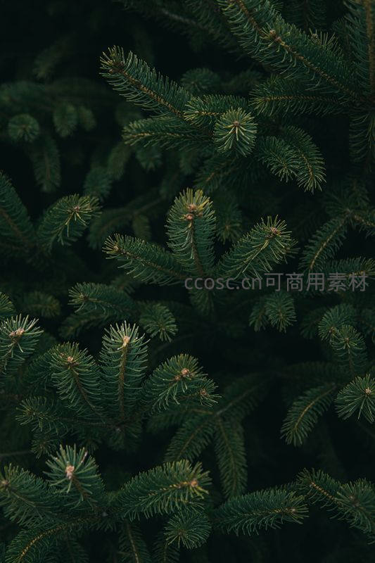 近距离捕捉深绿色松针的细腻纹理,在幽暗背景下更显其生机勃勃,传递出森林深处的宁静与力量。