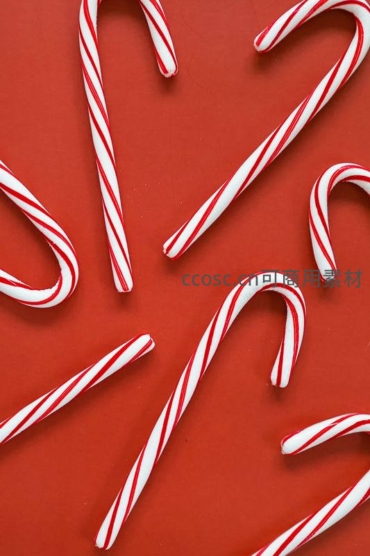 多根红白条纹拐杖糖随意散落在纯红色背景上,构图简洁明快,突出经典圣诞糖果的视觉冲击力。