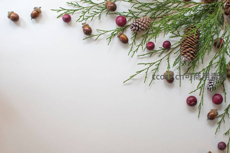 以天然橡果、红色浆果和松枝松果在纯白背景一角铺陈,展现质朴自然的圣诞风情,适合追求环保与简约的设计。