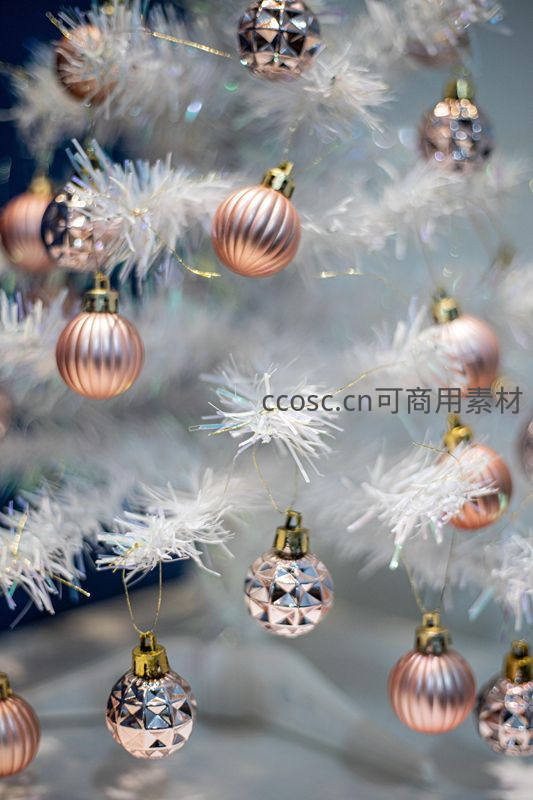 白色圣诞树上的玫瑰金装饰球