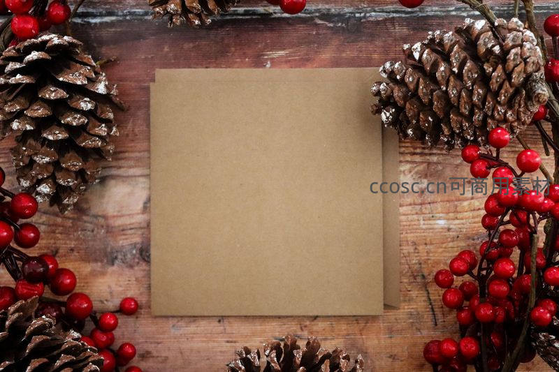 一张空白牛皮纸贺卡置于做旧木板上,四周环绕着天然松果和鲜红浆果,构成一幅充满自然气息与怀旧质感的圣诞主题静物图。
