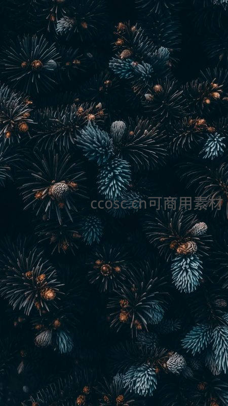 在幽暗背景下,深蓝色调的松枝与松果紧密排列,展现出冷峻而宁静的自然之美,细节丰富,质感突出。