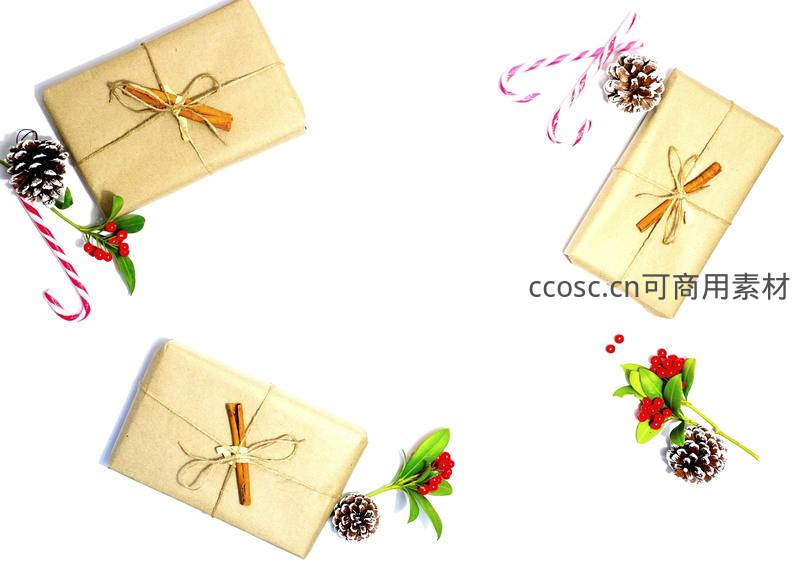 三份用牛皮纸包裹并系上肉桂棒的礼物盒分布在纯白背景上,四周点缀着松果、红浆果枝和红白条纹拐杖糖,构图简洁,充满自然节日气息。