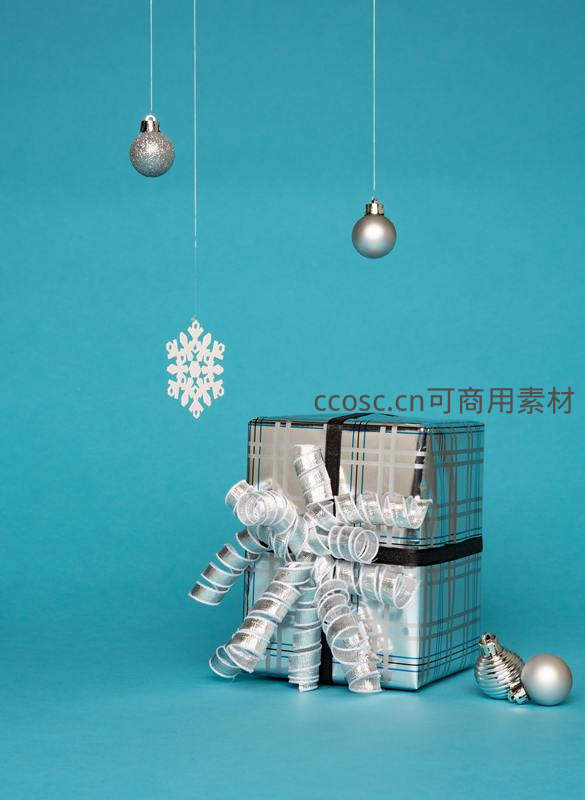 特写镜头聚焦于一个精美的银色格纹礼盒,其上系着蓬松的银色丝带蝴蝶结。背景是宁静的蓝色,几件银色球饰和雪花挂饰悬于空中,营造出梦幻的节日气氛。