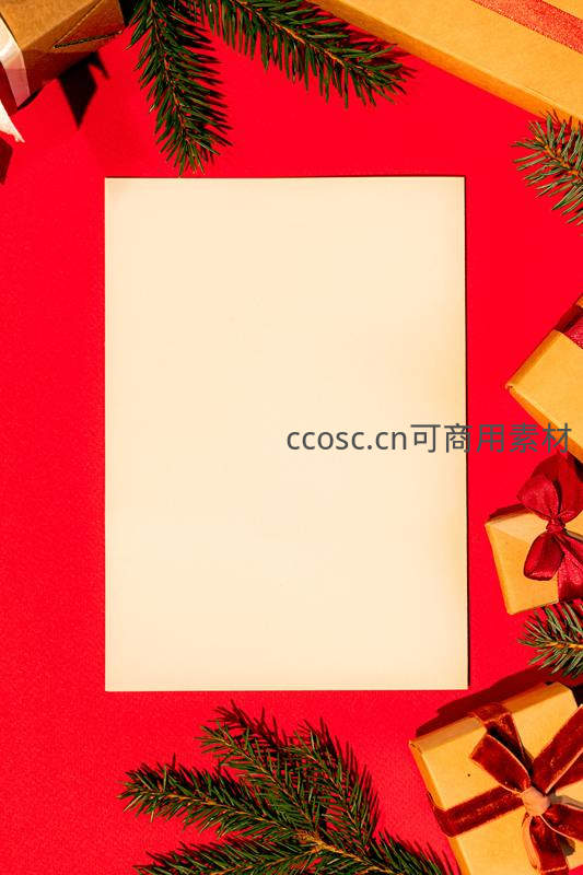 纯红色背景下,空白卡片被松枝与金色礼盒自然围合,构图简洁对称,突出节日元素,适合用作祝福或设计模板背景。