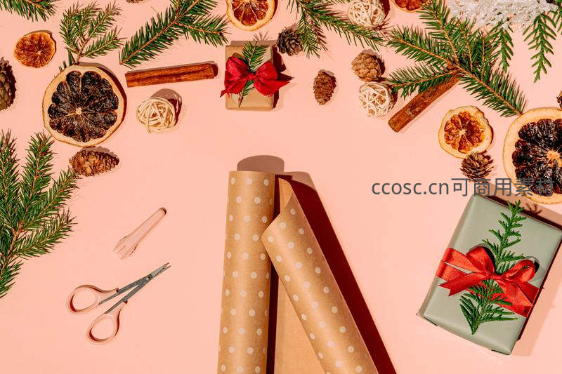 柔和粉色背景下,散落着包装纸卷、剪刀、肉桂棒和松枝,两个系着红丝带的礼盒点缀其间,呈现充满仪式感的圣诞礼物包装时刻。