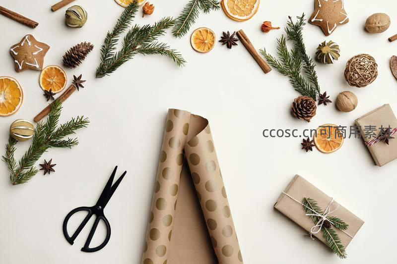 白色平面上散落着松枝、干橙片、肉桂棒、松果和姜饼人等圣诞元素,搭配卷起的波点包装纸和黑色剪刀,展现温馨的手工包装过程。