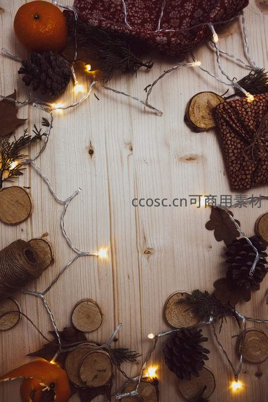 在浅色木质桌面上,松果、干橙片、小木片和暖黄色灯串围成边框,搭配花纹布袋,营造出温暖自然的节日氛围。