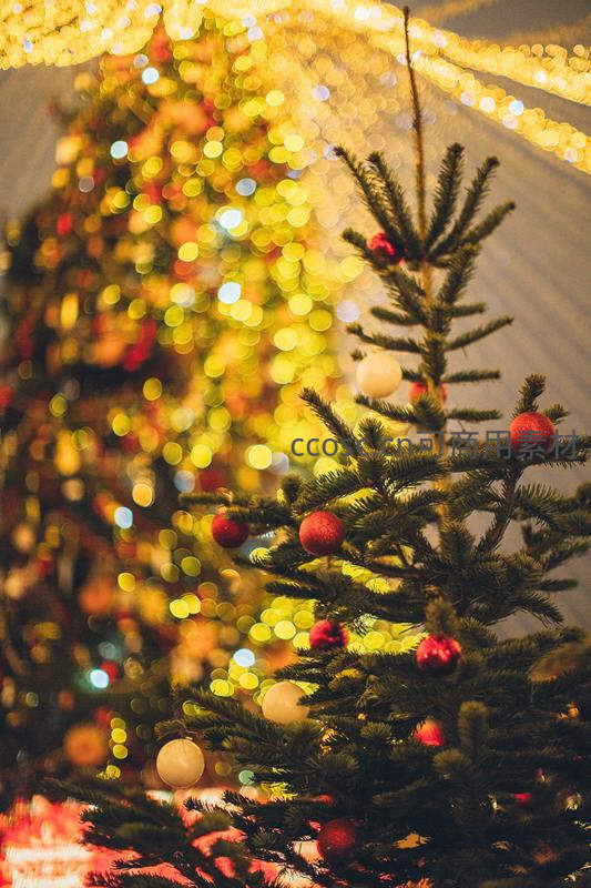 前景清晰的小圣诞树挂满红白彩球,后方大圣诞树在暖黄灯光下形成梦幻散景,层次分明,传递温馨愉悦的节日情绪。