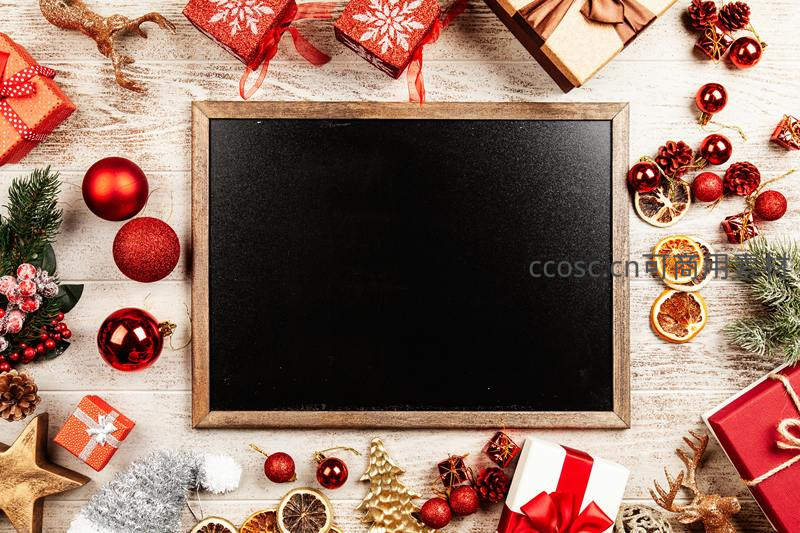 黑板居中环绕圣诞装饰的创意节日构图