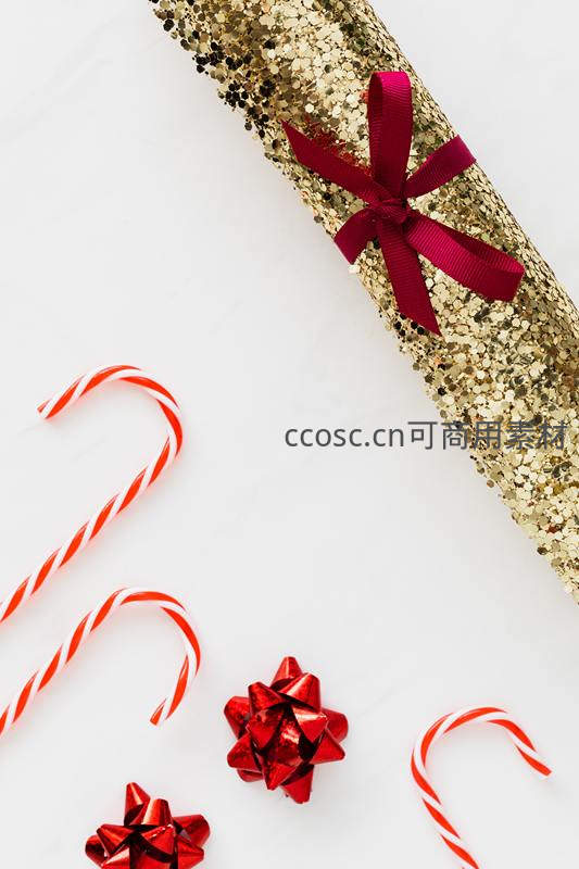一条覆盖金色亮片的卷轴斜置画面,系有深红色蝴蝶结,周围散落红白条纹拐杖糖和金属质感红色蝴蝶结,构图简洁,完美诠释了圣诞季的欢乐与甜蜜。