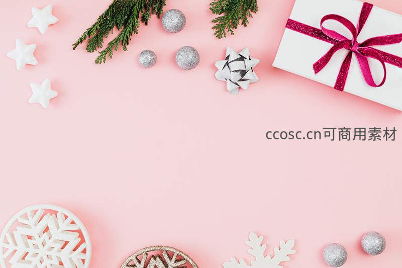 柔和的粉色背景上,散落着白色星星、银色球饰和绿色松枝,搭配一个系有闪亮红丝带的白色礼盒,营造温馨浪漫的节日氛围。