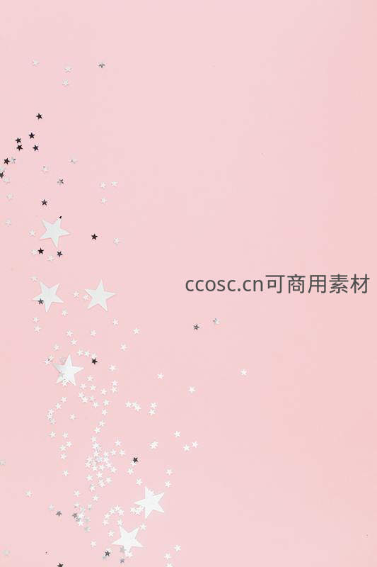 大量白色与银色星星亮片从左上角倾泻而下,在纯净粉色背景上形成流动感,营造出梦幻、轻盈且充满节日气息的视觉效果。