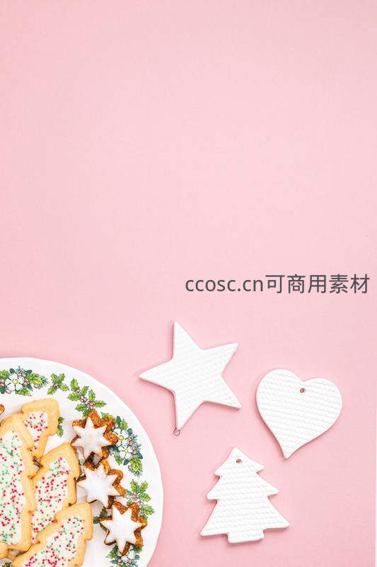在柔和的粉色背景上,摆放着一盘精美的圣诞主题饼干和几个白色陶瓷挂饰,营造出甜美而温馨的节日氛围。