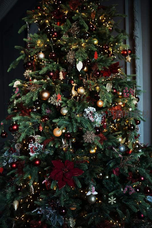华丽装饰的圣诞树闪烁温暖灯光