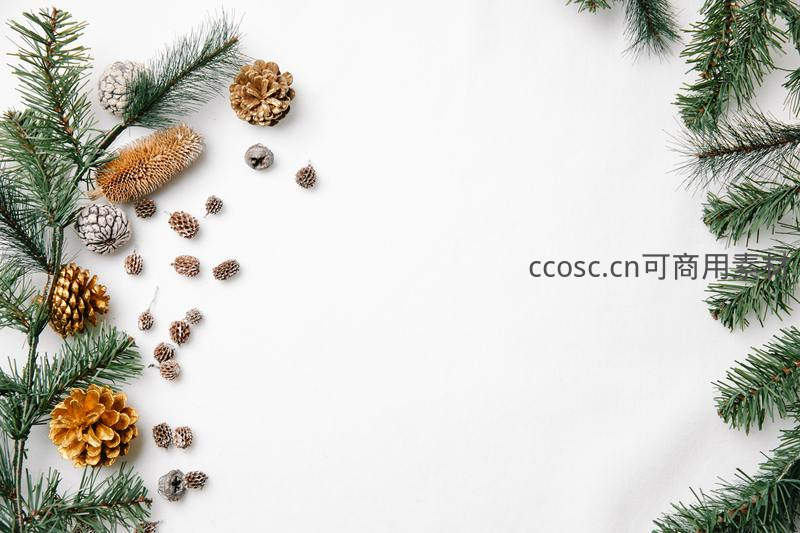 翠绿的松枝和金色、银色的松果在纯白背景上构成优雅的角落边框,简约而富有冬日气息,是理想的节日贺卡或海报底图。