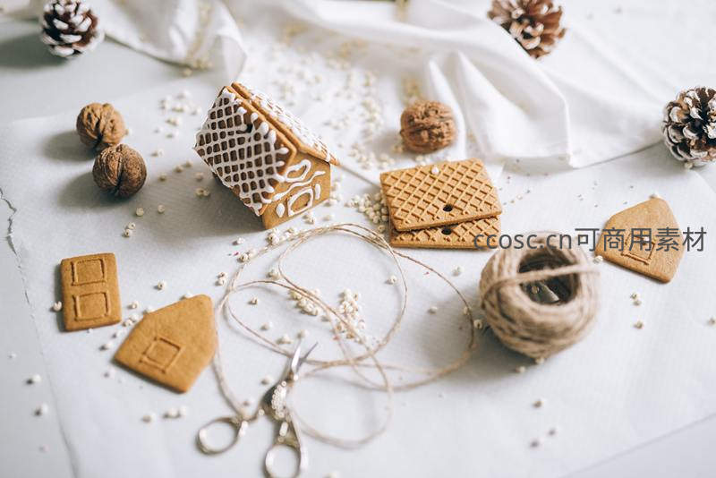 精致的姜饼屋、核桃、麻绳和剪刀散落在白色织物上,营造出温馨的手工制作场景,洋溢着浓厚的节日烘焙乐趣。