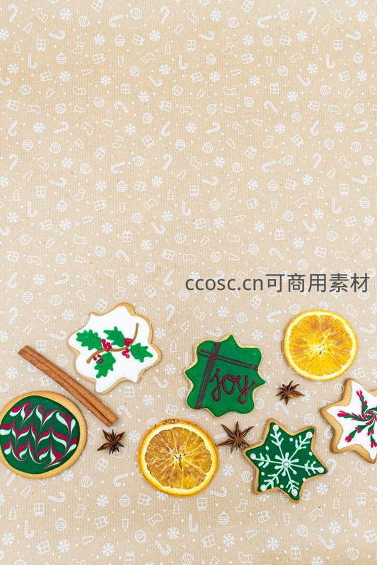 精致糖霜饼干配以干橙片、肉桂棒和八角,置于印有节日图案的纸面上,散发出浓郁的圣诞香气与手工温情。