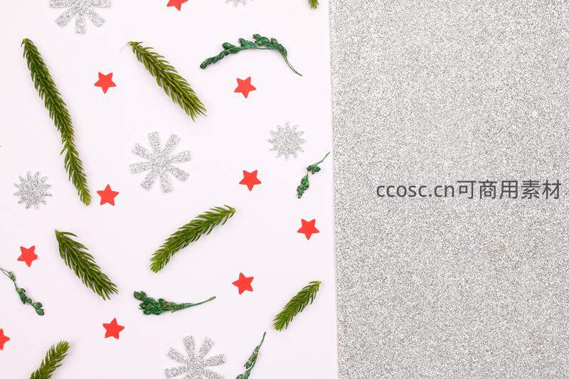 画面左侧布满绿色松枝、红色星星和银色雪花,右侧则是一片闪耀的银色闪光背景,形成鲜明对比,富有现代感和设计感。