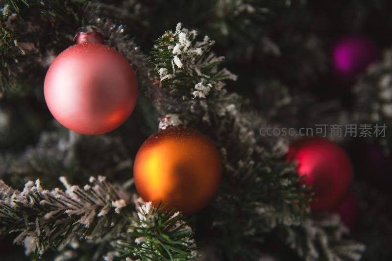 微距镜头下,覆着薄雪的松针间悬挂着红橙色的圣诞彩球,营造出温馨浪漫的节日气氛。