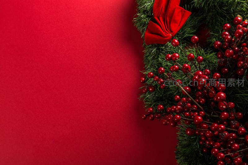 鲜红背景一侧摆放着缀满红浆果与大红蝴蝶结的圣诞花环,构图简洁,洋溢着浓郁的节日喜悦。
