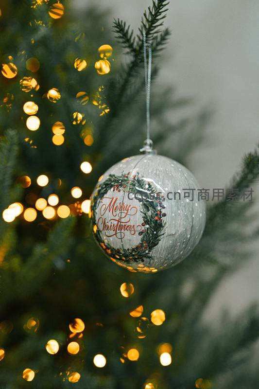 透明玻璃圣诞球悬挂于松枝之上,球内印有花环与'Merry Christmas'字样,背景暖黄灯光虚化成梦幻光斑,营造出浓厚的节日温馨氛围。