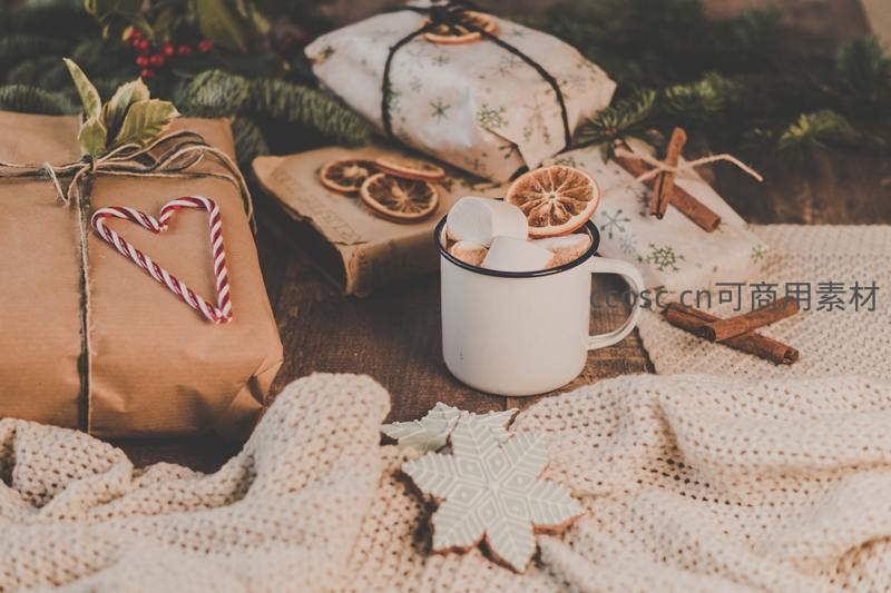 一杯热巧克力配棉花糖置于毛毯之上,周围环绕着手工包装的礼物、肉桂棒和干橙片,营造出温暖舒适的冬日居家节日氛围。